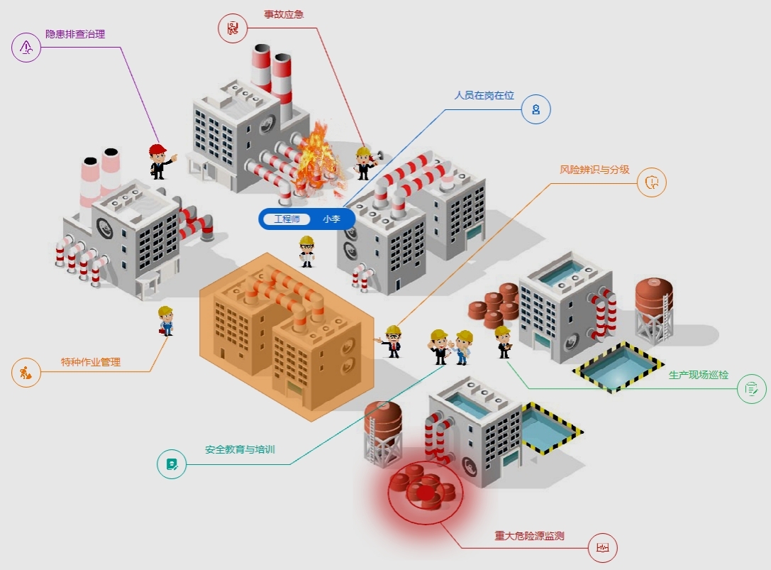 2)全面:覆盖风险风机管控、隐患排查治理、教育培训考试、危险作业、相关方、重大危险源、设备设施等各类监控点信息。