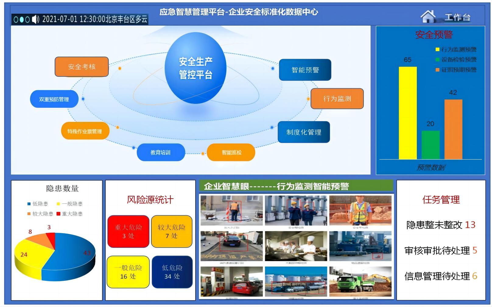 平台自动采集企业安全管理各环节的相关数据,自动汇总、智能分析,自动生成台账、报表、图表(如柱状图、饼状图、折线图)和安全趋势图,为企业决策提供数据支持。
