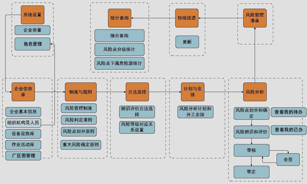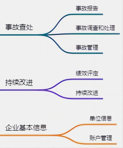 本平台系统按照目标职责、制度化管理、教育培训、现场管理、安全风险管控及隐患排查治理、应急管理、事故管理和持续改进 8 个体系的核心技术要求,为企业安全生产标准化管理体系建立提供了可参照的标准化核心体系。